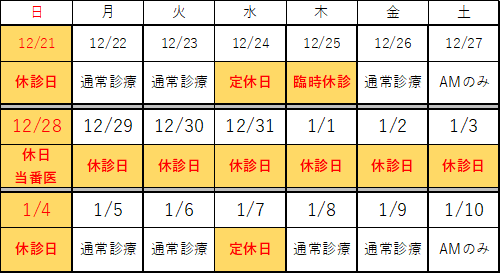上記期間を休診とさせていただきます。年末の通常診療最終日は12月27日(土)AMまで、年始は1月5日(月)より診療を開始いたします。